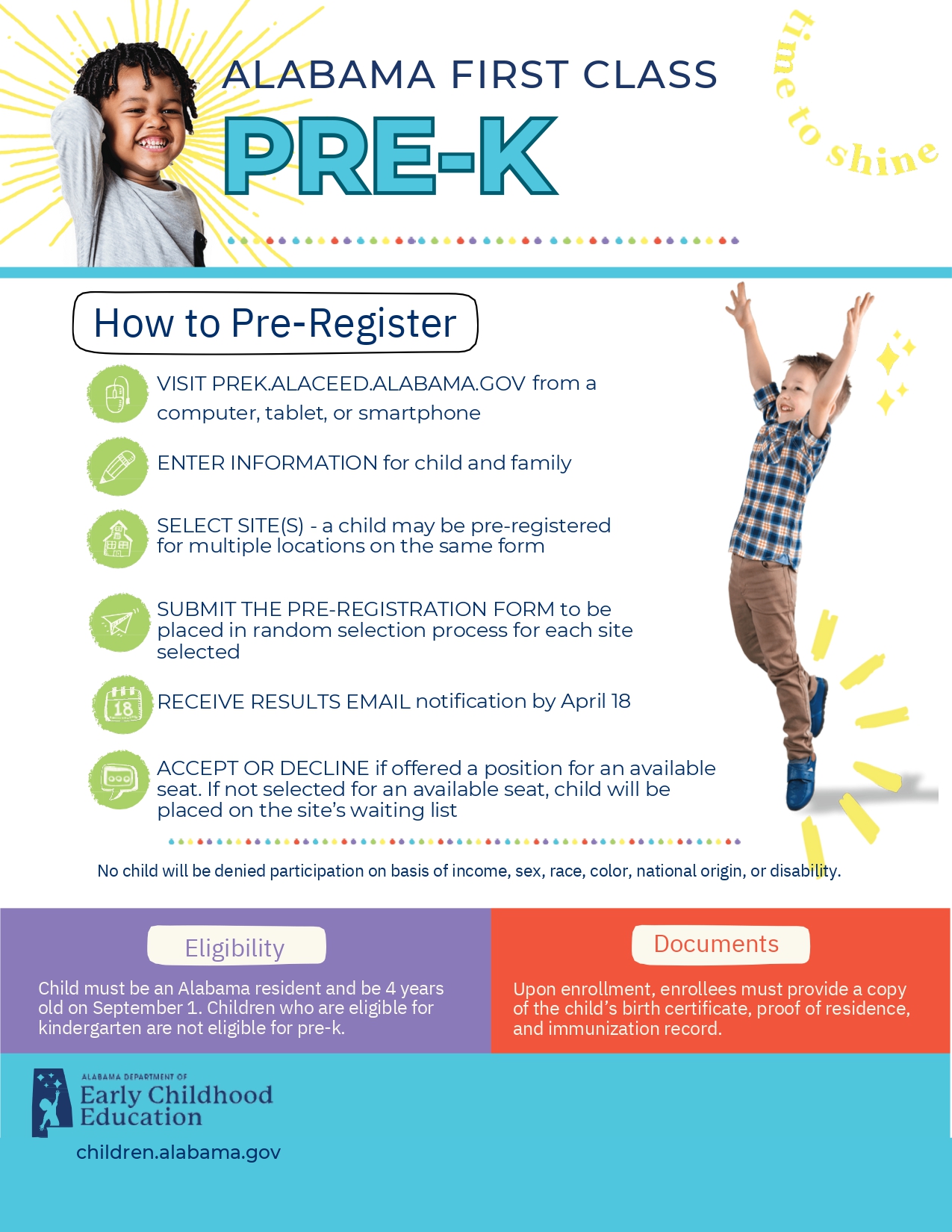 Pre-registration is open for the 2026-2027 Alabama First Class Pre-K. See the attached information. Contact Dr. Jaclyn Rivers (jaclyn.rivers@scsboe.org) with questions.